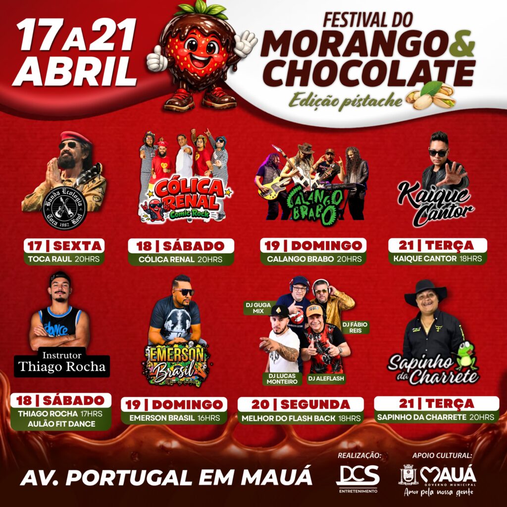 A partir desta sexta-feira (17), começa oficialmente o Festival do Morango & Chocolate – Edição Pistache, em Mauá. O evento acontece na Avenida Portugal e segue até terça-feira (21), Feriado de Tiradentes, reunindo gastronomia temática, música ao vivo e atrações para toda a família.