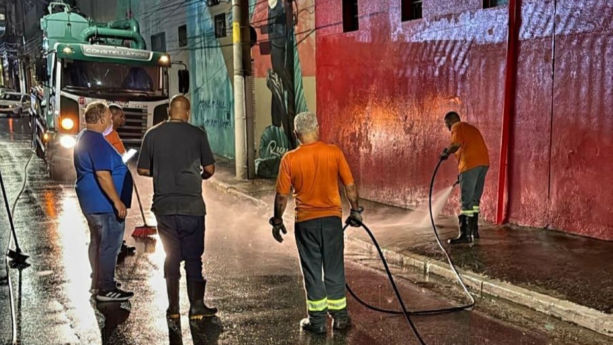Sob o viaduto Miguel Etchenique, equipes da limpeza urbana realizaram lavagem da via e varrição das calçadas, enquanto agentes de trânsito reorganizavam o acesso de veículos aos bairros. “Nosso efetivo se dividiu por toda a cidade, priorizando os pontos com maior acúmulo de água. Foram realizadas podas e remoções emergenciais de árvores, limpeza de bocas de lobo e canaletas, retirada de entulhos, além de varrição e lavagem das vias. Também fizemos bloqueios pontuais para retirada de barro em ruas do Botujuru e Silvina. Mais de 80 servidores atuaram nas primeiras horas após a chuva, garantindo a limpeza da cidade até a madrugada deste domingo”, destacou o secretário municipal de Serviços Urbanos, Luiz Bortoletto.