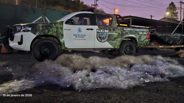 DEFESO – Desde 1º de novembro de 2025, início do período do defeso, a GCM Ambiental intensificou as ações de fiscalização na Represa Billings e em áreas de proteção ambiental de São Bernardo do Campo. Até o momento, o balanço aponta a apreensão de aproximadamente 2.450 metros de redes de pesca, 22 tarrafas, uma rede de lambari, uma rede de arrasto e duas armadilhas para caça de tatu, além de 22 quilos de peixes. Também foram resgatados e devolvidos ao habitat natural 50 peixes vivos.