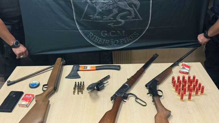 A Guarda Civil Municipal de Ribeirão Pires e a Polícia Civil do Estado de São Paulo prenderam em flagrante, na noite da última segunda-feira (9), homem por violência doméstica e crimes relacionados à posse irregular de armas de fogo, no distrito de Ouro Fino Paulista. A ação resultou na apreensão de revólver, espingarda, carabina, arma de pressão e munições de diferentes calibres.